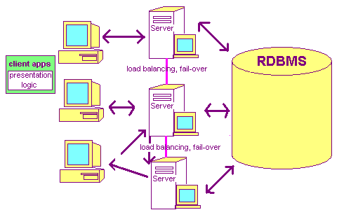 In this 3-tier model, the business logic is contained in a separate application, often running on a separate machine, accessible by multiple clients. Client applications now only contain the display logic and call to methods on the middle-tier for retrieval and manipulation of the data. The middle-tier is responsible for executing client requests and fetching data from and resolving data to the DBMS. The middle-tier should, like the DBMS, be able to service multiple clients simultaneously while maintaining synchronization and integrity of the data in coordination with the DBMS.