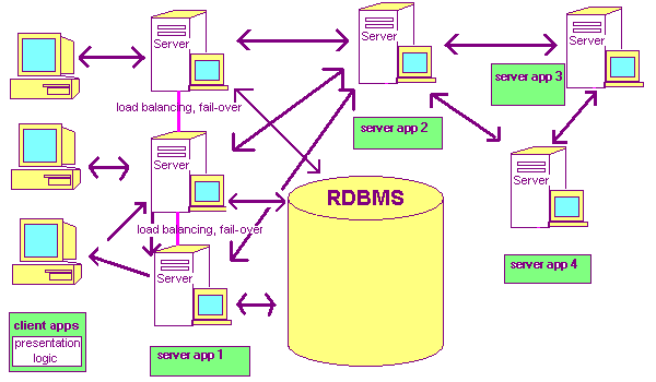 This arrangement has been used for some time in the practise of computing where data is stored on machines running a database management system (DBMS), typically an SQL DBMS, such as Interbase, Oracle, Sybase, MSSQL, Informix. Access and manipulation of the data is performed by applications running on client workstations. Both display logic and business logic are contained within the client application.